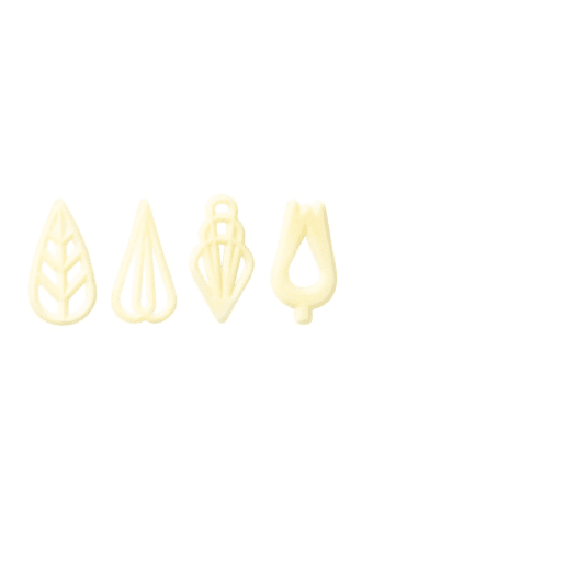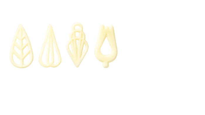 Zestaw ażurków „Finezja biała” to dekoracje wykonane z białej czekolady, w czterech różnych wzorach. Smukłe, podłużne formy czekoladowe, mają długość 40 mm i delikatne, ażurowe kształty nawiązujące do motywów roślinnych.